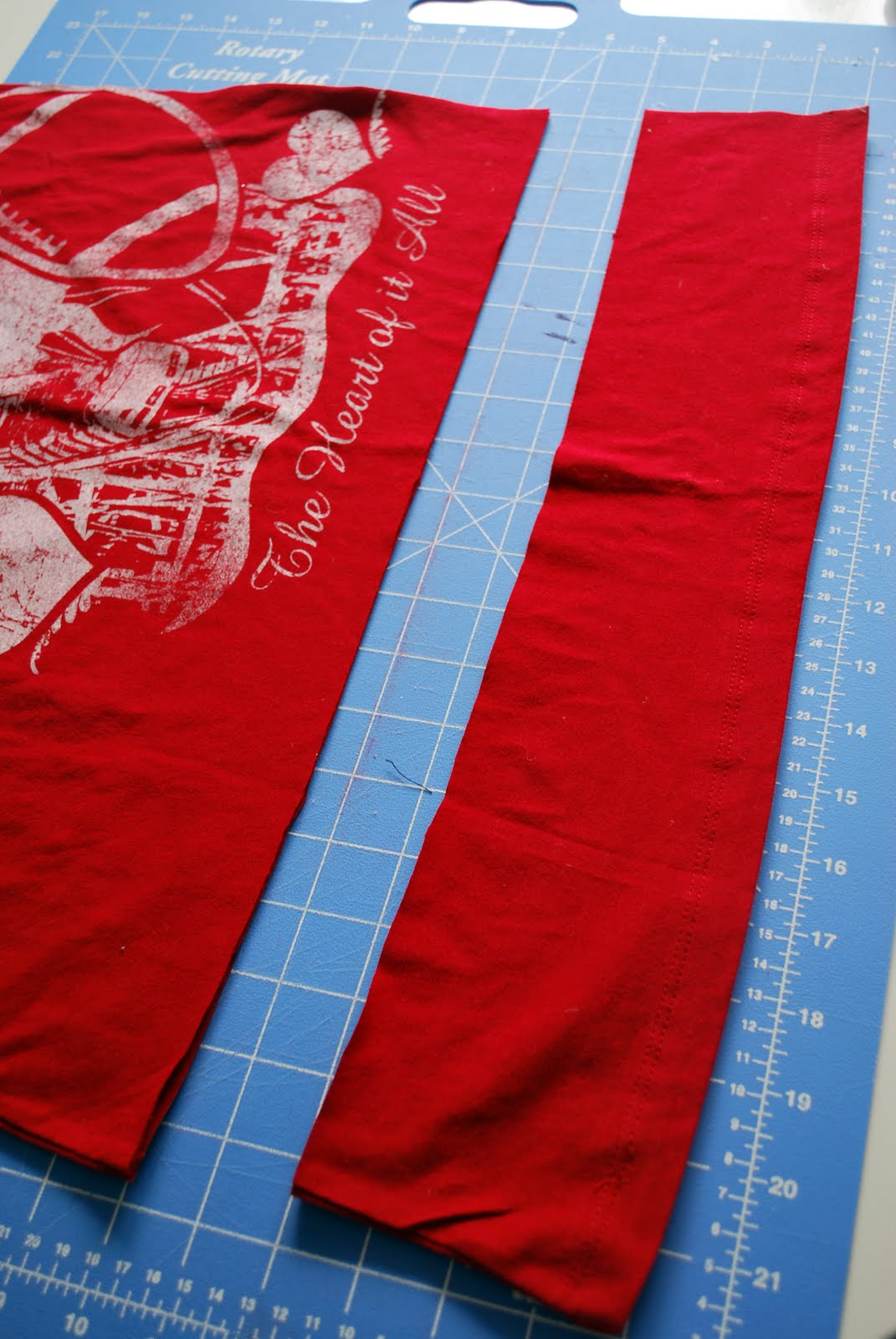 You will need to cut out 2 15x16 inch pieces of both the tee and the coordinating fabric. It is easiest to cut the t-shirt pieces at the same time using the front and back of the t-shirt.