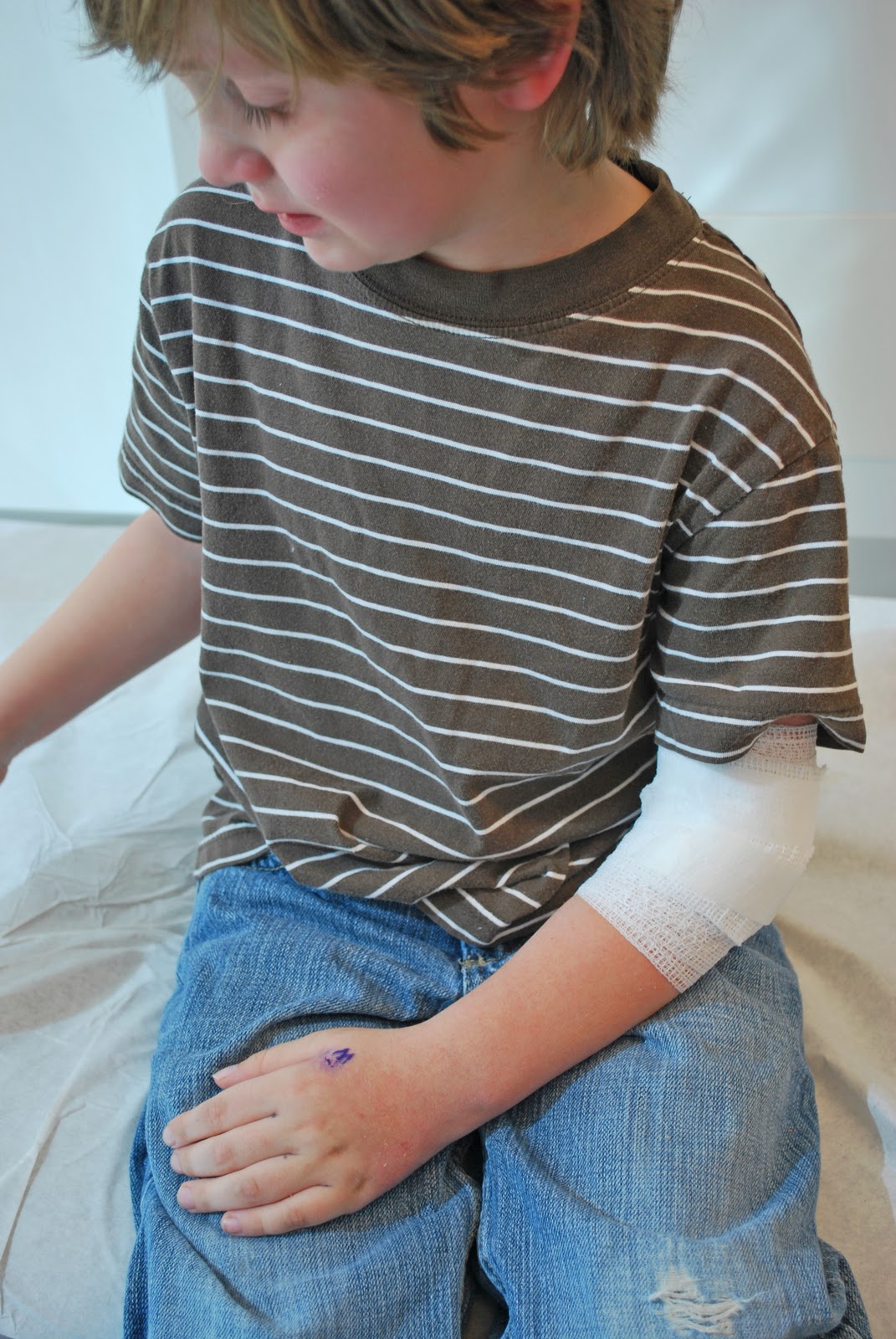 Finally we got him calmed down. His arm got bandaged up. He was still quite solemn at the loss of his cast, even the talk of Old McDonalds (what he calls McDonalds) didn't cheer him up immediately.