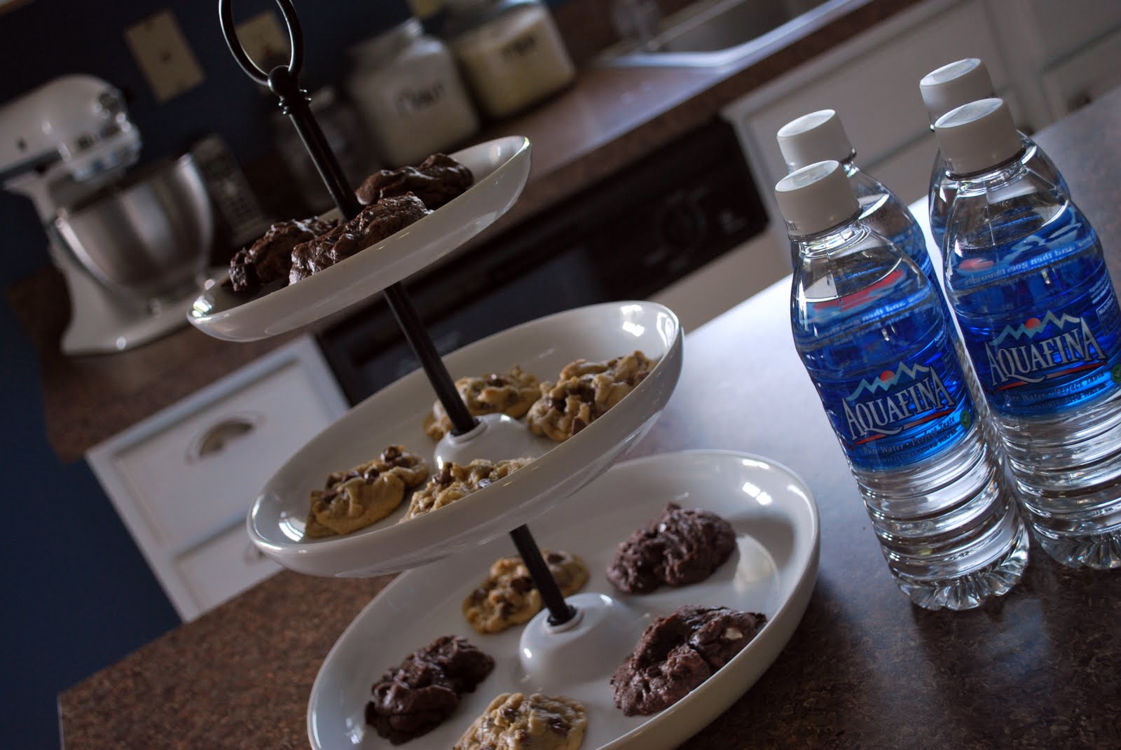 I whipped up a couple of batches of cookie dough, ate some dough, and then put it in the fridge to later use when we have a showing. Before a showing I bake some up. Then I put them on my cute tiered platter and set out some bottles of water.