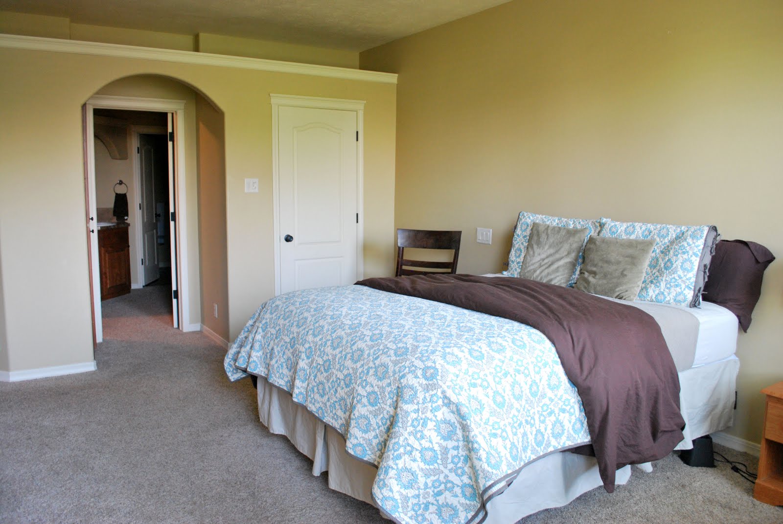 I have never really shown our bedroom on the blog before because it is yawn-errific. It still lacks a little in decoration, but it is a great room. We love it. Fun fact: the first night we stayed in the room I laid in bed, turned off the light, and then saw something glowing on the ceiling above me...