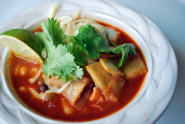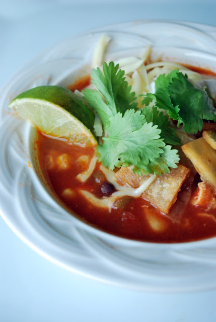 Within 30 minutes of serving, fry up the tortilla pieces. Then set them out with the cheese, sour cream, and cilantro when ready to serve soup. Garnish soup with the toppings you like...I highly recommend all of them!