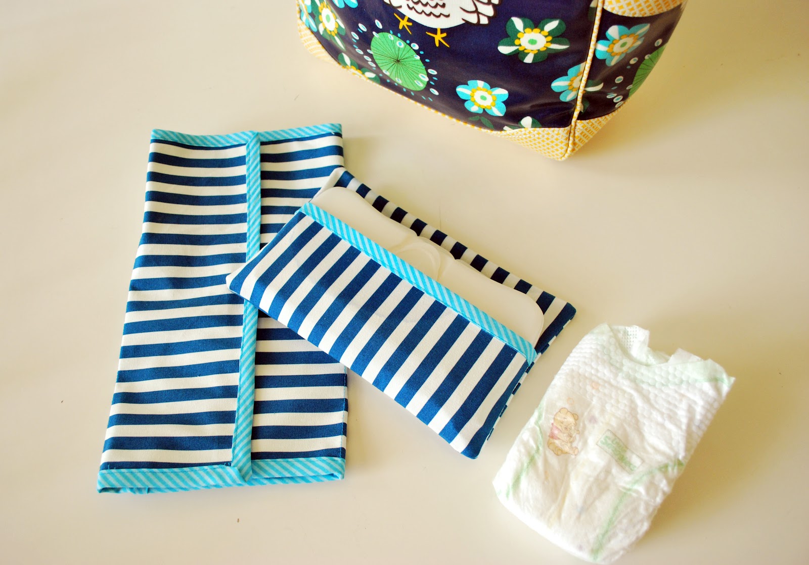 Originally I made the wipes case to simply hold loose wipes. I lined the sucker with vinyl and everything. ALAS, the moisture from the wipes still leaked through a little and the outside fabric got wet. The good news is that the little wipes pouch perfectly pockets a small wipes case. So wipes went into the case, case went into the fabric cover, and fabric stayed dry.
