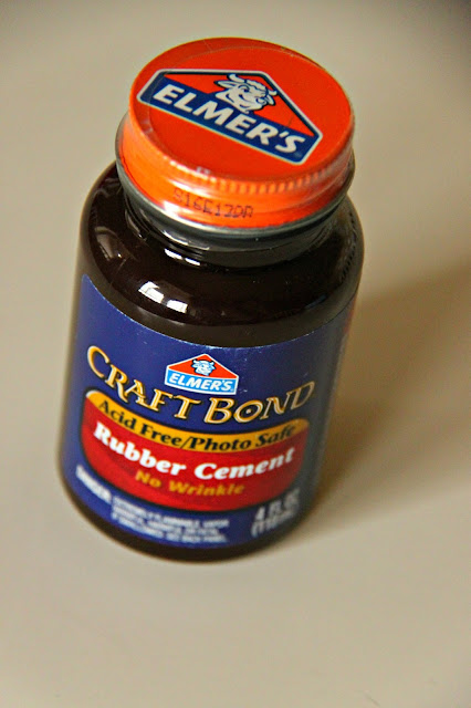 Set them up on top of something, like an upside down cup. And I recommend laying down newspaper because the rubber cement might drip. Liberally brush the top edge with rubber cement. Make sure to coat it evenly, catching every page. Coat several times.